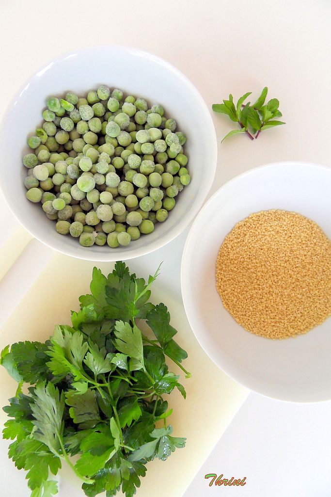 A vizet sóval, citromborssal felforralom. Ráöntöm a kuszkuszra. A zöldborsót oliva olajon megpárolom. Felaprítom a petrezselyem levelet és a mentát. Hozzáadom a kuszkuszhoz a megpuhult borsót és a zöldfűszereket, öntök rá olajat és összekeverem.